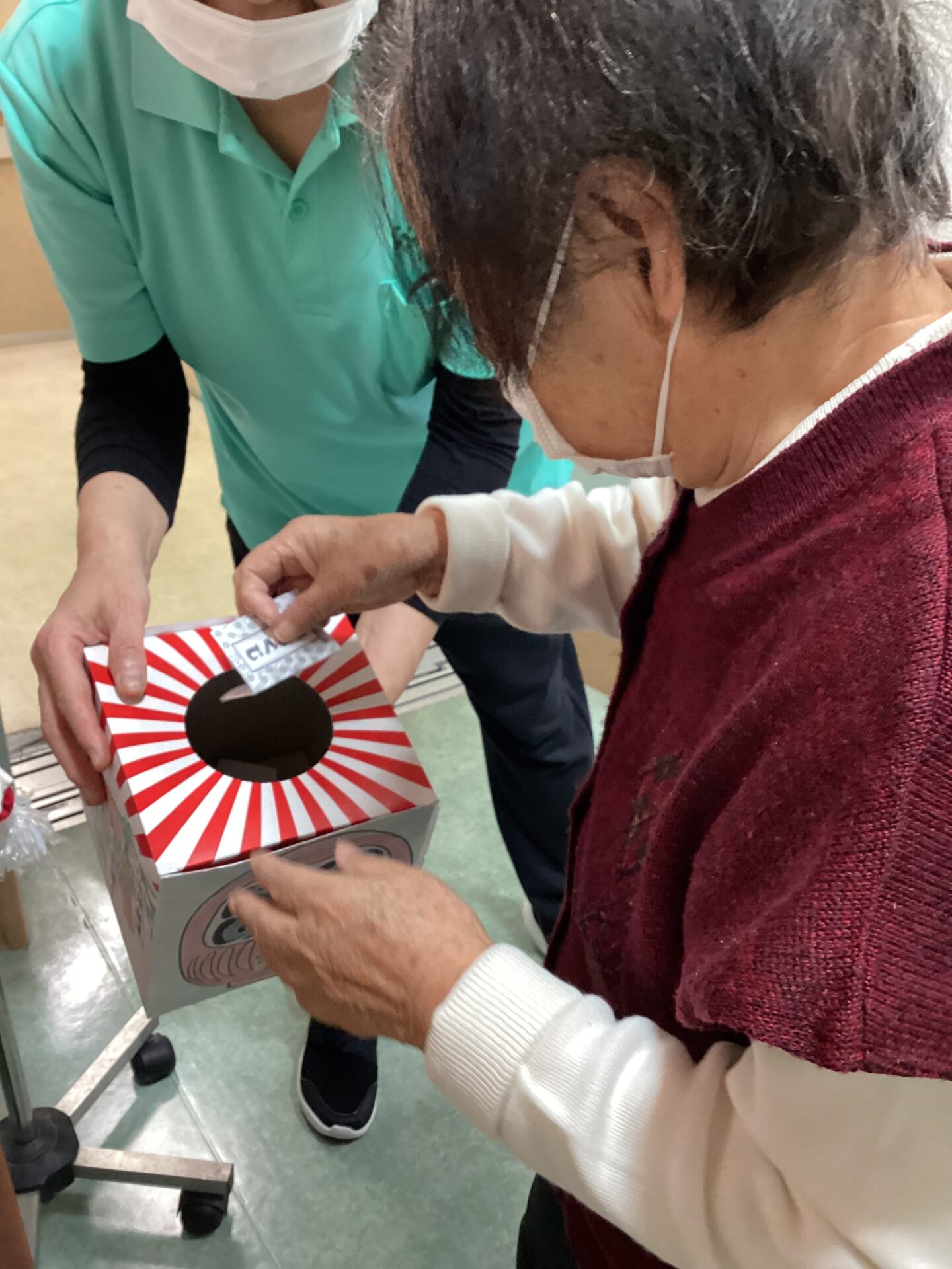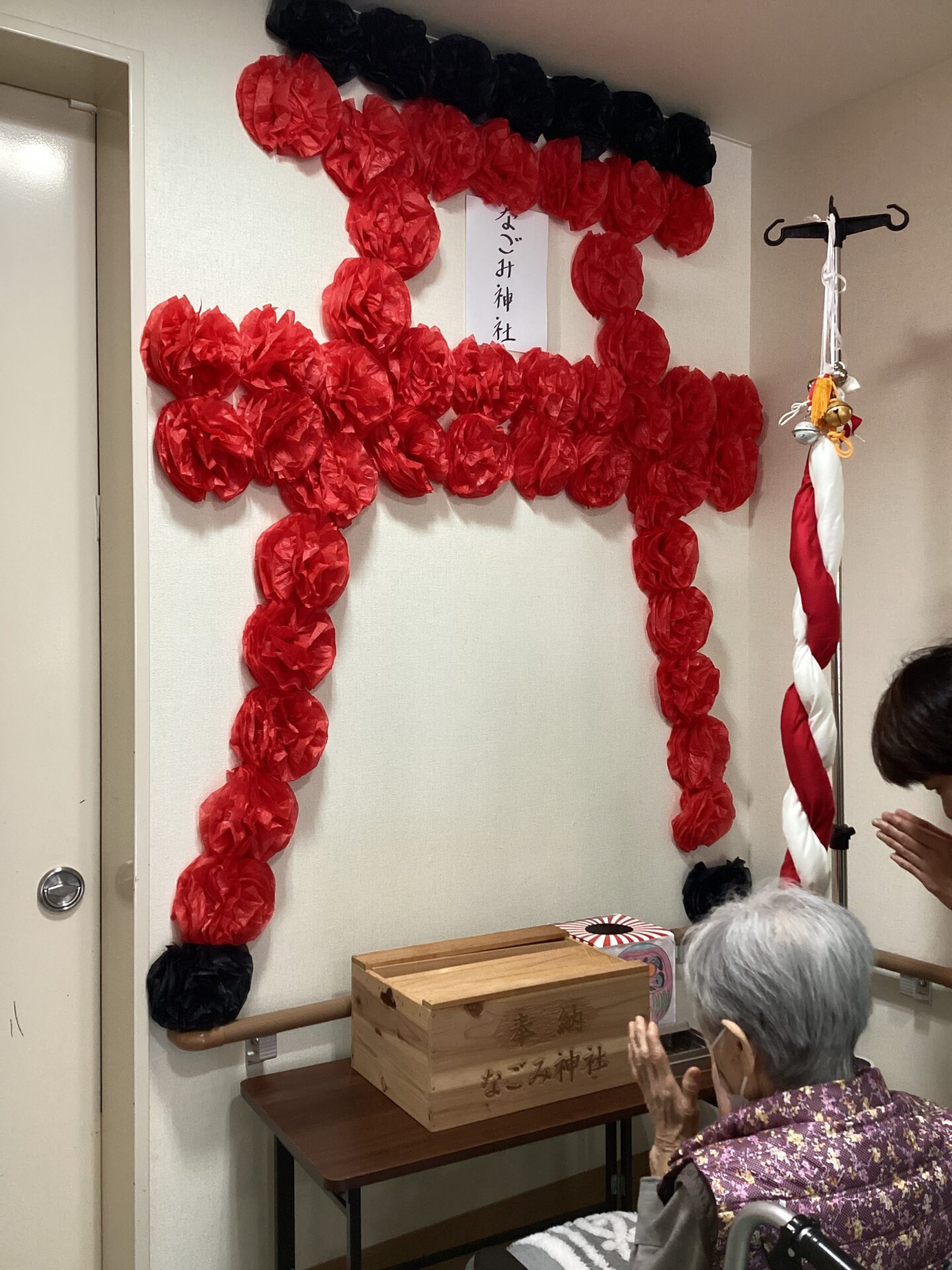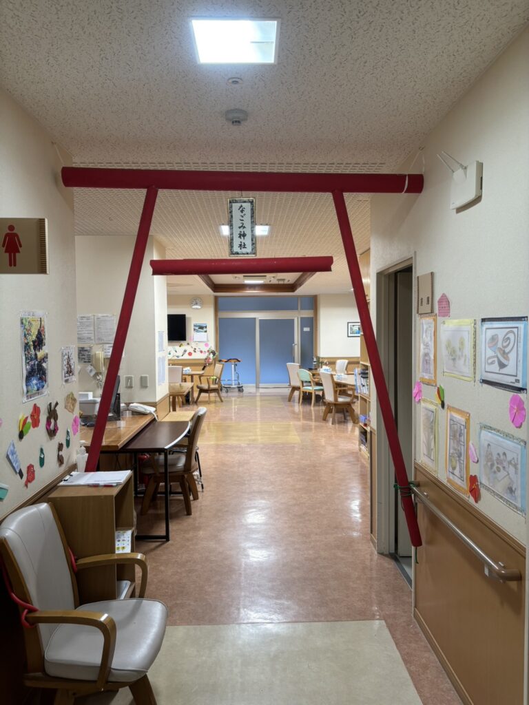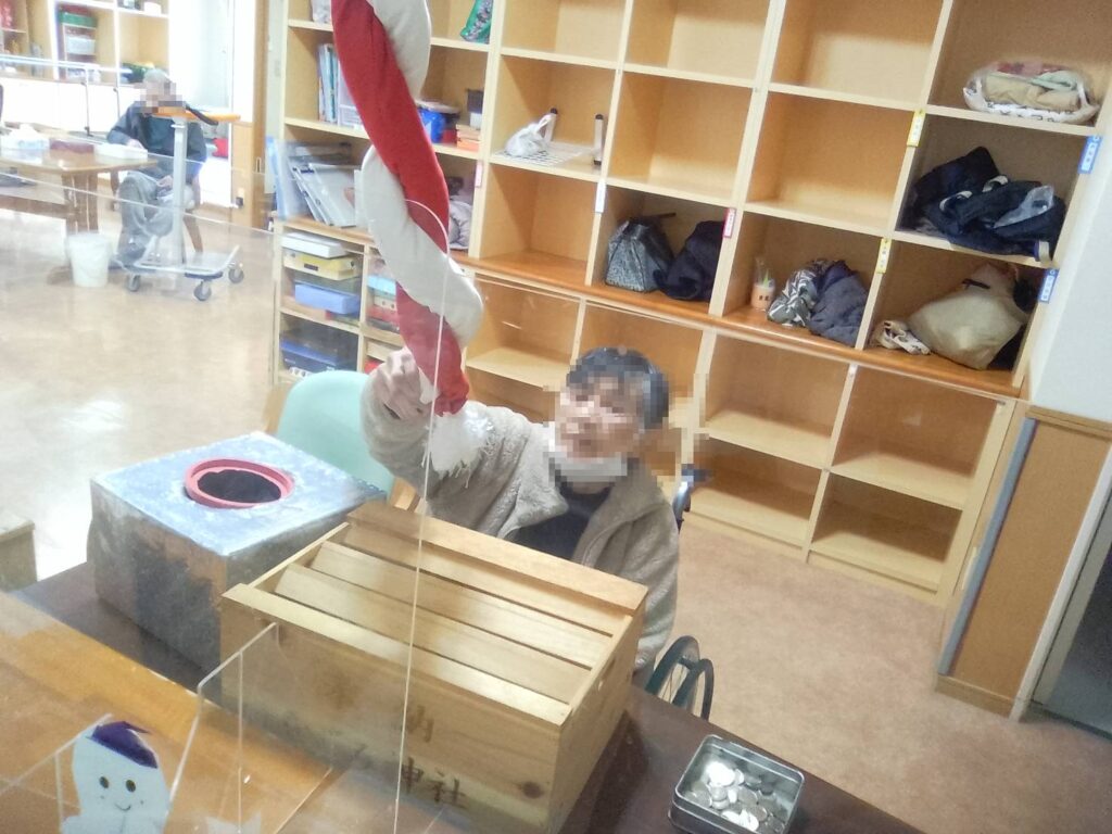 各フロアには手作りの鳥居を設置し、利用者の皆さまにおみくじを引いていただいたり、お賽銭を投じて健康を願っていただいたりしました。